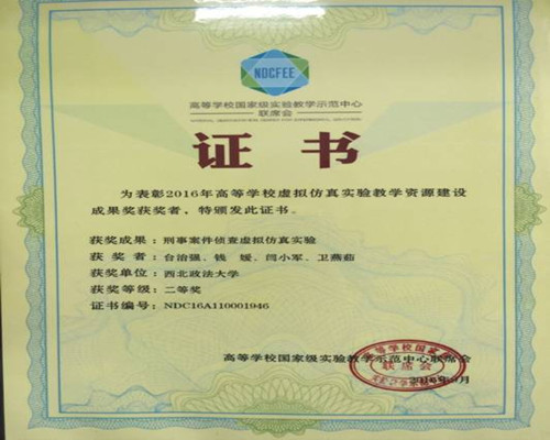 “刑事案件侦查虚拟仿真实验”获奖证书